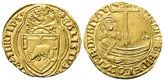 Dr. °+CALISTVS✿ °- °PP° TERTIVS°. Stemma sormontato da triregno e chiavi decussate, entro cornice quadrilobata. Rv. MODICE• FIDEI• QVARE• DVBITATIS•. San Pietro in navicella, con lunga croce.