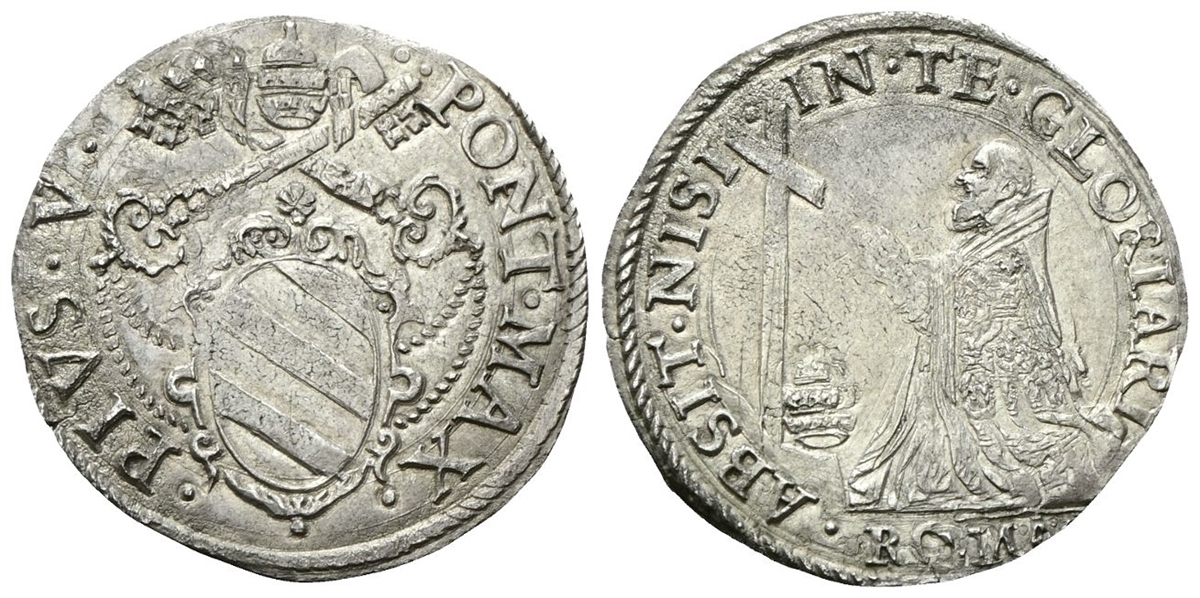 Dr. •PIVS• V• - • PONT• MAX•. Stemma ovale in cornice sormontato da triregno e chiavi decussate. Rv. •ABSIT• NISI - • - IN• TE •GLORIARI. Il Papa in ginocchio davanti alla croce; a s., tiara; in esergo, ROM[A C].