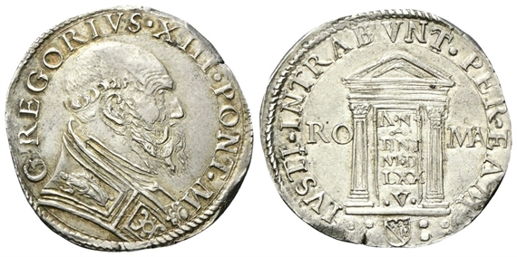 Dr. GREGORIVS• XIII •PONT• M. Busto a d., con piviale decorato con S. Pietro. Rv. IVSTI •INTRABVNT• PER •EAM. Porta Santa; nel vano, AN / DNI / M•D / LXX / •V•; ai lati, RO - MA; in esergo, segno di zecca.