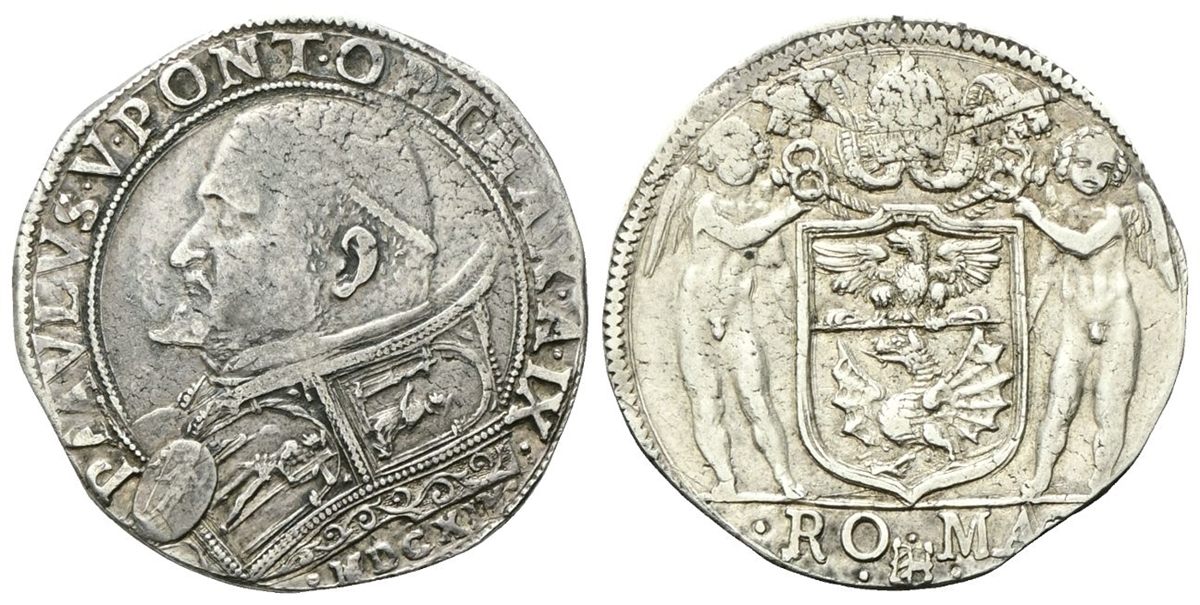 Dr. PAVLVS• V• PONT• OPT•MAX• A• IX•. Busto a s. con piviale decorato con due figure; sotto, •MDCXIV•. Rv. Anepigrafe. Stemma a targa semiovale sorretto da due angeli; in esergo, •RO(segno di zecchiere: Roberto Primi) MA•.