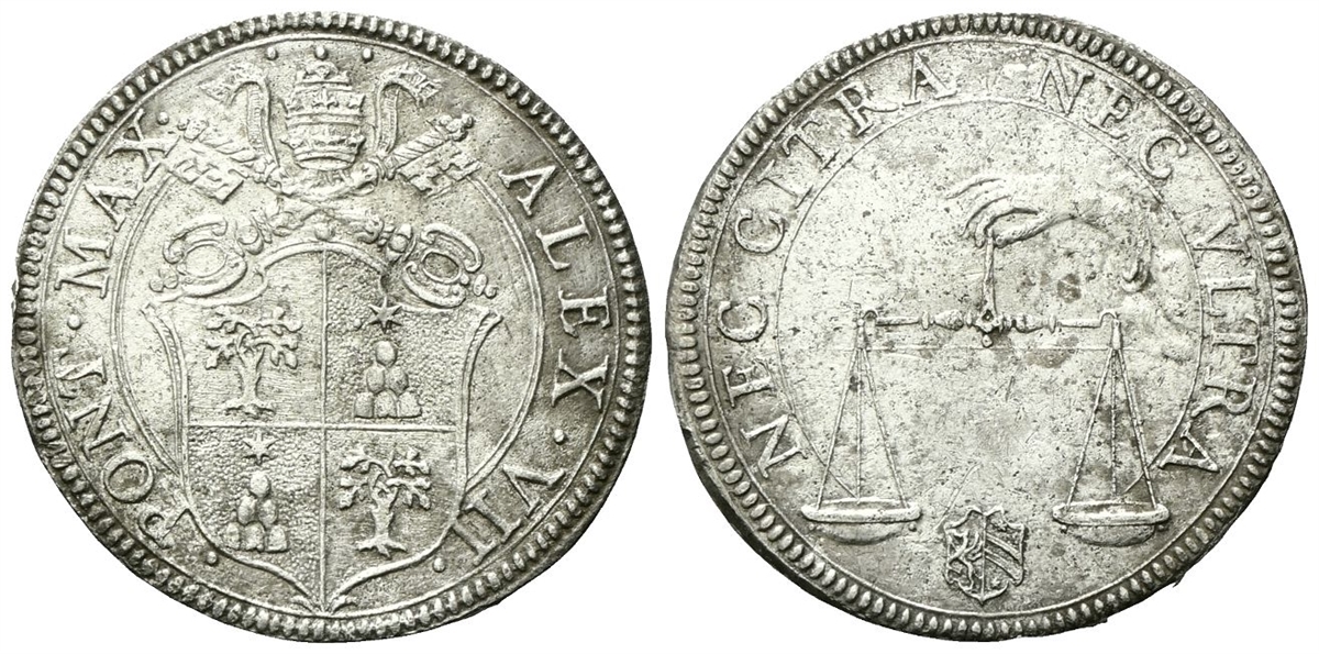 Dr. ALEX •VII• - PONT• MAX•. Stemma sormontato da triregno e chiavi decussate. Rv. NEC CITRA NEC VLTRA. Destrocherio, uscente dalle nubi, regge una bilancia; sotto, armetta Martelli e Ubertini.