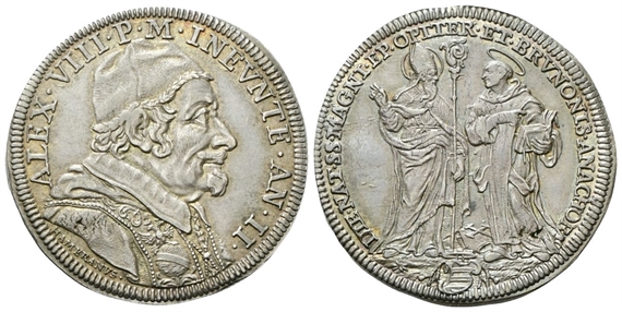 Dr. ALEX •VIII •P •M •INEVNTE• AN• II•. Busto a d., con camauro, mozzetta e stola; sotto il taglio del braccio, HAMERANVS•. Rv. DIE •NAT• SS• MAGNI• EP• OPITER• ET• BRVNONIS• ANACHOR. San Magno e San Brunone stanti; in esergo, stemma Patrizi.