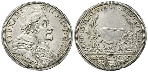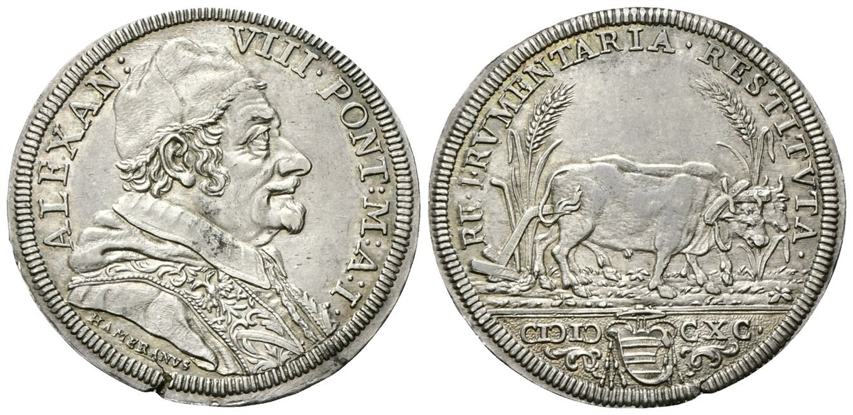Dr. ALEXAN: - VIII •PONT: M: A :I:. Busto a d., con camauro mozzetta e stola; sotto il taglio del braccio, HAMERANVS. Rv. RE• FRVMENTARIA• RESTITVTA•. Aratro tirato da due buoi verso d.; ai lati, due spighe; in esergo, stemma Patrizi accostato dalla data.
