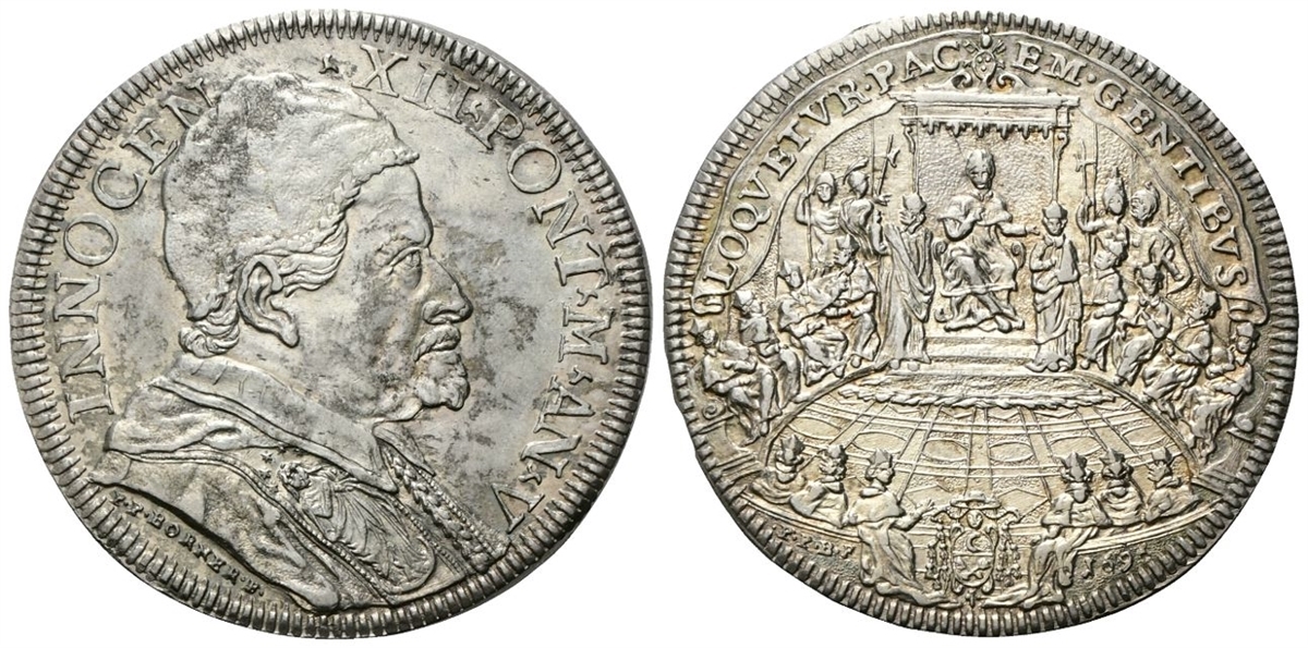 Dr. INNOCEN - ▴XII ▴ PONT▴ M▴ AN▴ V. Busto a d., con camauro e stola con l’Immacolata; sotto la troncatura della spalla, P P BORNER F. Rv. LOQVETVR• PAC - EM • GENTIBVS. Il Pontefice in Concistoro; in esergo, P• P• B• F (armetta Farsetti) 1696.