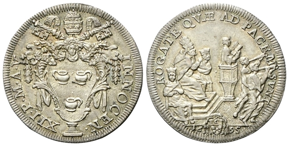 Dr. INNOCEN• - XII•P•M•A•V. Stemma sormontato da triregno e da chiavi decussate. Rv. ROGATE QVAE AD PACE - M - SVNT. Il pontefice in trono ascolta l’oratoria per la pace; sotto, 16 (stemma Farsetti) 95.