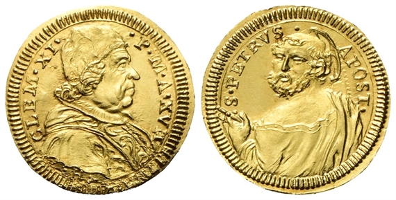 Dr. CLEM• XI• - •P• M• A• XVII. Busto a d., con camauro, mozzetta e stola decorata con arabeschi; sotto il taglio del busto, H. Rv. S• PETRVS • - APOST•. Mezzo busto di San Pietro, retrospicente.