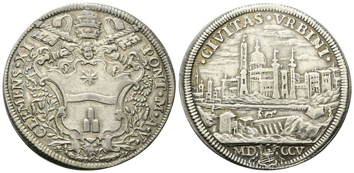 Dr. CLEMENS ✶XI - PONT✶ M✶ A ✶V✶. Stemma con testina di putto in cimasa sormontato da triregno e chiavi decussate; ai lati, E - H. Rv. ✶CIVITAS ✶VRBINI✶. Veduta di Urbino; in esergo, MD armetta D’Aste CCV.