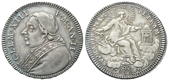 Dr. CLEM •XIII - P• M• AN •II. Busto a s., con camauro e piviale decorato da croce raggiante e arabeschi. Rv. SVPRA• FIR - MAM - PETRAM•. La Chiesa seduta verso s., tra le nubi; sotto, 17 (stemma De Vecchis) 60.