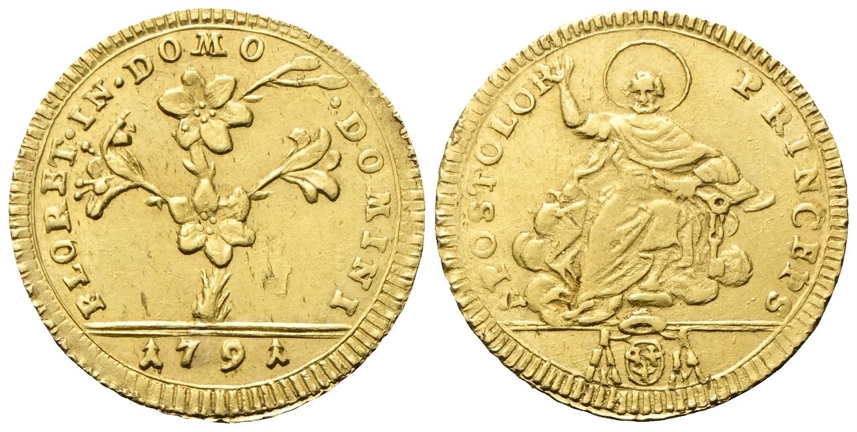 Dr. FLORET• IN• DOMO - •DOMINI. Pianta di giglio con quattro fiori; in esergo, 1791. Rv. APOSTOLOR - PRINCEPS. San Pietro stante su nubi con la d. alzata e la mano s. che stringe la chiave; in esergo, armetta Lante.