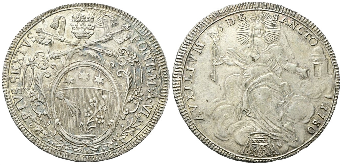 Dr. PIVS SEXTVS - PONT• M• A• VI. Stemma ovale in cornice sormontato da triregno radiante e chiavi decussate. Rv. AVXILIVM - DE - SANCTO 1780. La Chiesa seduta su nubi; sotto, stemma Vai.