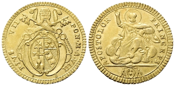 Dr. PIVS - VII - PON •M• A• VIII. Stemma sormontato da triregno e chiavi decussate. Rv. APOSTOLOR - PRINCEPS. San Pietro seduto tra le nubi con chiavi; in esergo, stemma Lante.