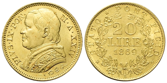 Pio IX (Giovanni Maria Mastai Ferretti), 1846-1878. 20 Lire 1869 a. XXIV, busto grande.