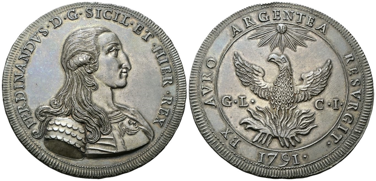 Dr. FERDINANDVS• D• G• SICIL• ET• HIER• REX. Busto corazzato a d. Rv. EX AVRO ARGENTEA RESVRGIT•. La Fenice con ali spiegate sulle fiamme, entro cerchio lineare, illuminata da sole raggiante con volto umano; ai lati, G• L• - C• I• (Gabriele Lancillotto Castello, interino); sotto, 1791•.