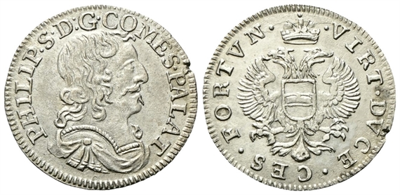 Dr. PHILIP• S •D: G• COMES• PALAT. Busto a d. Rv. •VIRT• DVCE• CES •FORTVN•. Aquila bicipite coronata.