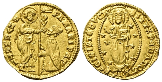 Dr. PA•MARIPET' - S•M•VENETI. San Marco stante verso d., porge il vessillo al Doge genuflesso; lungo l’asta, sotto l’orifiamma, D/V/X. Rv. SIT•T•XPE•DAT• Q TV - REGIS •ISTE• DVCAT'. Il Redentore stante e frontale entro aureola ellittica cosparsa di stelle.