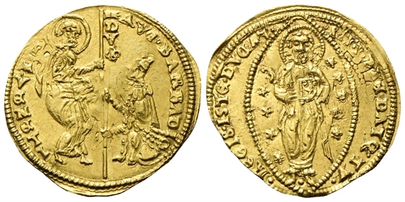 Dr. AVG•BARBADICO - •S•M•VENETI. San Marco stante verso d., porge il vessillo al Doge genuflesso; lungo l’asta, sotto l’orifiamma, D/V/X. Rv. •SIT•T•XPE•DAT Q•TV• - •REGIS•ISTE• DVCAT. Il Redentore stante e frontale entro aureola ellittica cosparsa di stelle.