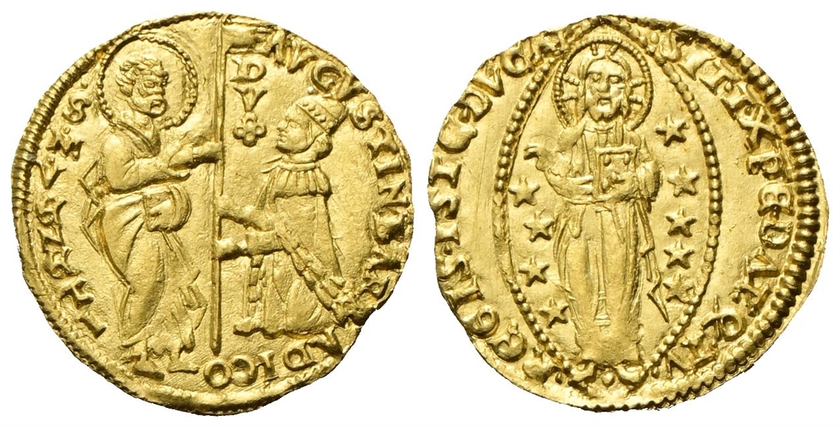 Dr. •AVGVSTIN BARB - ADICO • - •S•M•VENETI. San Marco stante verso d., porge il vessillo al Doge genuflesso; lungo l’asta, sotto l’orifiamma, D/V/X. Rv. •SIT•T•XPE•DAT•Q•TV• - REGIS•ISTE DVCAT•. Il Redentore stante e frontale entro aureola ellittica cosparsa di stelle.