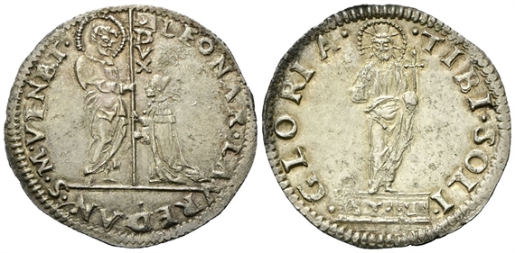 Dr. LEONAR• LAVREDAN• S• M•VENET•. San Marco consegna lo stendardo al doge inginocchiato; lungo l'asta, D/V/X. Rv. •TIBI• SOLI• - •GLORIA•. Il Redentore, stante su piedestallo, regge globo crucigero e solleva la d. per benedire; sul piedistallo, iniziali del massaro.