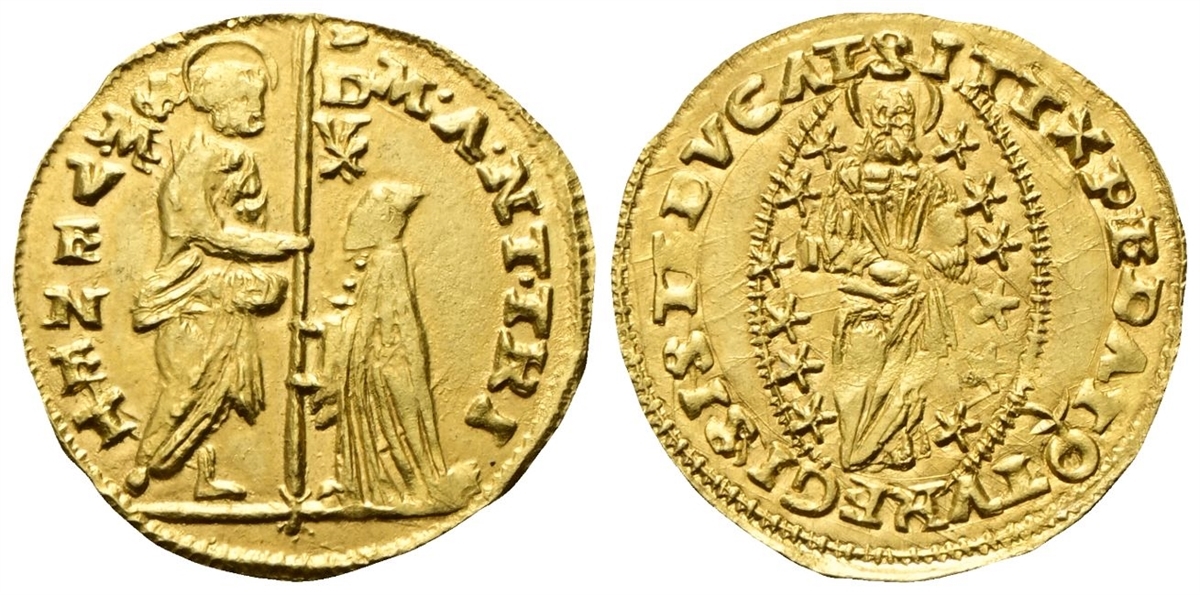 Dr. •M•ANT•TRI - • -S•M•VENET. San Marco stante verso s., porge il vessillo al Doge genuflesso; lungo l’asta, sotto l’orifiamma, D/V/X. Rv. SIT T XPE DAT Q TV - REGIS ISTE DVCAT. Il Redentore stante e frontale entro aureola ellittica cosparsa di stelle.