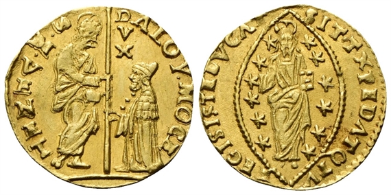 Dr. ALOy•MOCE - S•M•VENET. San Marco stante verso s., porge il vessillo al Doge genuflesso; lungo l’asta, sotto l’orifiamma, D/V/X. Rv. SIT• T XPE DAT Q TV - REGIS ISTE DVCAT. Il Redentore stante e frontale entro aureola ellittica cosparsa di stelle.