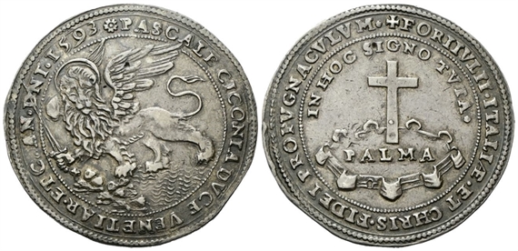 Dr. ✿PASCALE CICONIA DVCE VENETIAR•ET C•AN• - DNI•1593. Leone alato con spada, poggia le zampe posteriori sul mare e l'anteriore su rocce alla cui sommità vi è una piccola croce. Rv. +FORI IVLII•ITALIÆ•ET CHRIS•FIDEI PROPVGNACVLVM*. Grande Croce sulla fortezza di Palmanova, nel cui interno la scritta PALMA; sopra, IN HOC SIGNO TVTA•.