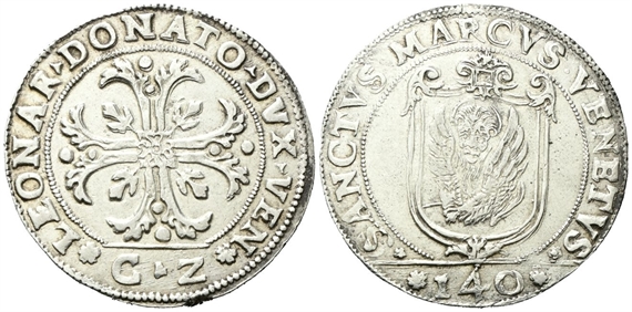Dr. ✿LEONAR▴ DONATO ▴DVX ▴VEN✿. Croce fogliata, con rosa al centro e foglie di vite agli angoli; in esergo, iniziali del massaro C Z. Rv. ✿SANCTVS • MARCVS • VENETVS✿. Leone in soldo sopra scudo ornato di fogliame; in esergo, 140.
