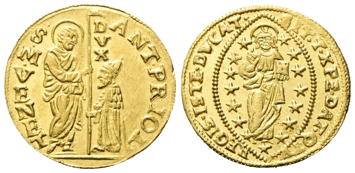 Dr. ANT•PRIOL•- •S•M•VENET. San Marco stante verso s., porge il vessillo al Doge genuflesso; lungo l’asta, sotto l’orifiamma, D/V/X. Rv. SIT•T•XPE•DAT•Q•TV - REGIS•ISTE•DVCAT•. Il Redentore stante e frontale entro aureola ellittica cosparsa di stelle.