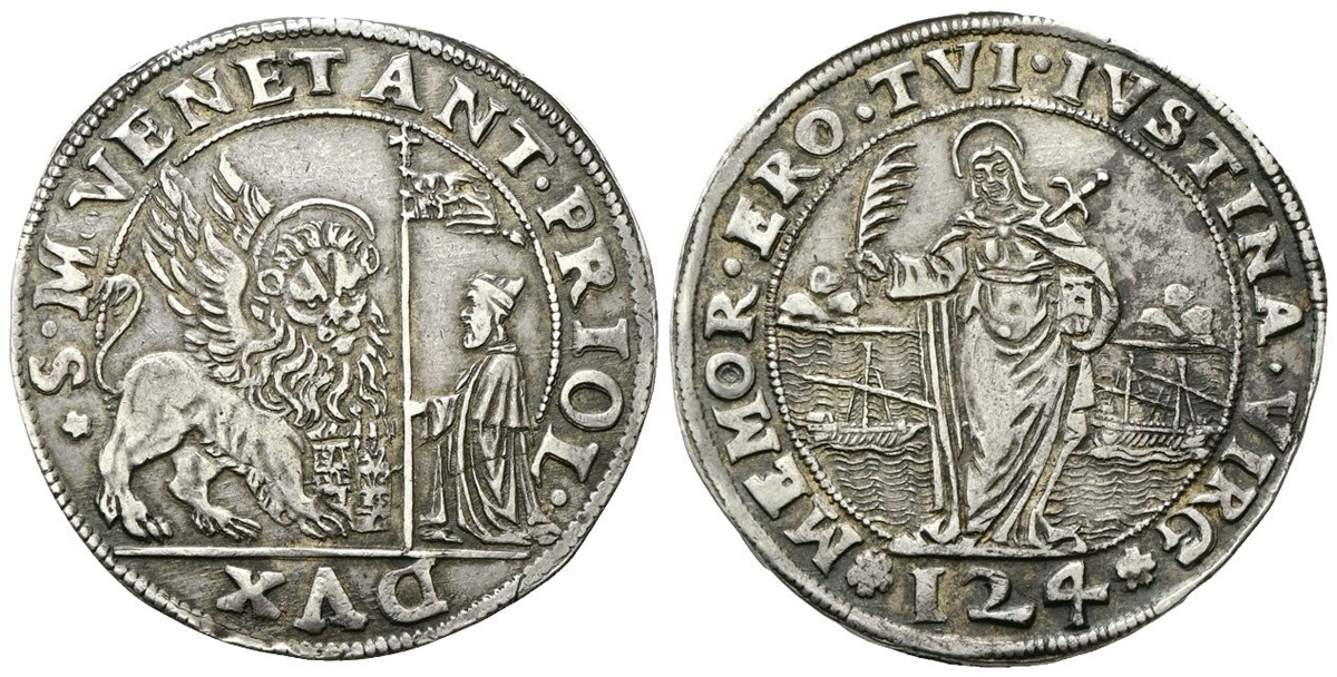 Dr. ✿S•M•VENET ANT•PRIOL • / DVX. Il leone, alato e nimbato verso d., con la zampa anteriore appoggiata sul libro aperto; a d., il doge genuflesso con vessillo. Rv. ✿MEMOR• ERO• TVI •IVSTINA •VIRG✿. S. Giustina stante e frontale, con il seno trafitto da pugnale, regge una palma nella d. e il libro nella s.; sullo sfondo, due galere in navigazione e all’orizzonte, due monti.