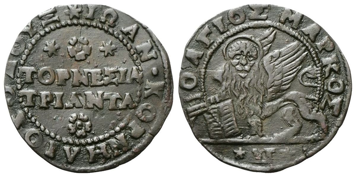 Dr. ✶IΩAN•KOPNHΛIOSO ΔOYΞ. ✶✿✶TOPNEΣIA / TRIANTA/ ✿. Iscrizione disposta su due righe. Rv. O AΓIOΣ MAPKOΣ. Leone alato e nimbato con la zampa anteriore sul libro aperto; in esergo, ✶II✶.