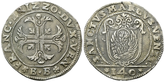 Dr. ✿FRANC ▴ERIZZO▴ DVX▴ VEN✿. Croce fogliata, con rosa al centro e foglie di vite agli angoli; all’esergo iniziali del massaro, B◂ B. Rv. •SANCTVS• MARCVS• VENET•. Leone in soldo sopra scudo ornato di fogliame; in esergo, ✶140✶.