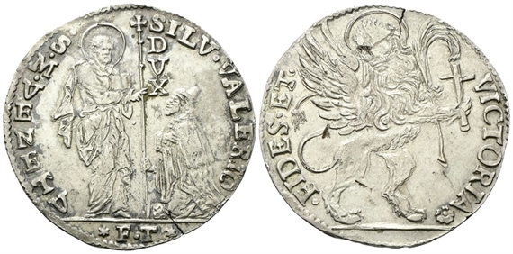 Dr. SILV•VALERIO - •S•M•VENETV. San Marco nimbato, stante verso d., benedice il doge genuflesso che regge il vessillo; lungo l'asta, D/V/X; in esergo, ✶F•T✶, (Francesco Trevisan massaro). Rv. •FIDES•ET• - VICTORIA✿. Leone alato e nimbato, rampante, tiene nella zampa d. una croce e, nella s., la palma.