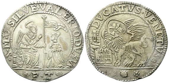 Dr. •S•M•V•SILVE•VALERIO•DVX. San Marco seduto in trono verso d., benedice e porge con la mano d. il vessillo sormontato da un a croce al Doge genuflesso; in esergo, ✿F•T✿. Rv. DVCATVS•VENETVS✿. Leone alato, andante verso s., con le zampe posteriori sul mare, quelle anteriori in terra delle quali una poggia sul libro ove in lettere incuse si legge: “PAX TIB MA EV NG LIT”; dinnanzi al leone, un monte con castello turrito; in