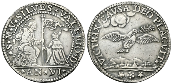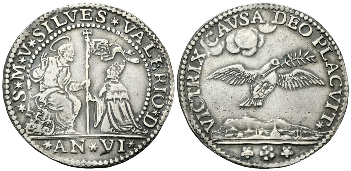 Dr. ✶S✶ M✶ V✶ SILVES✶ VALERIO✶ D✶. San Marco in trono, porge il vessillo al Doge genuflesso; in esergo, ✶AN✶ VI✶. Rv. VIXTRIX CAVSA DEO PLACVIT ✶. Una colomba con un ramo d'ulivo nel becco volteggia sopra un paesaggio; sopra, una nuvola; in esergo, una rosetta tra due stelle.