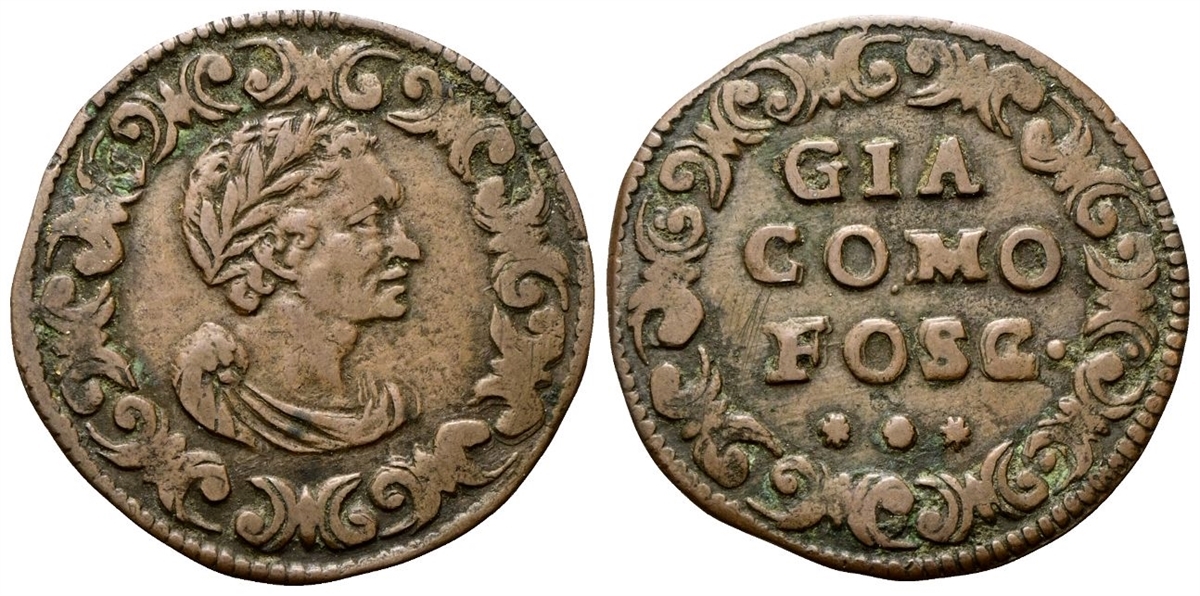 Dr. Busto laureato e drappeggiato di G. Foscarini a d.; attorno, fregio. Rv. GIA / COMO / FOSC. Iscrizione disposta su tre righe entro fregio gigliato