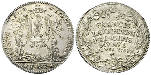 Dr. ✿S• M• V •FRANC✿ - ✿LAVRED•DVX✿. San Marco, stante verso s., indica il quadro dell’Immacolata Concezione sorretto da due cherubini; a d., il Doge in preghiera e tra i due, il leone accovacciato e il corno dogale; in esergo, ✿ F•A•B•✿ (Francesco Antonio Bonlini, massaro). Rv. FRANCIS• / LAVREDANI / PRINCIPIS / MVNVS / AN• VII• 1758. Iscrizione disposta su cinque righe entro corona di fiori chiusa in alto da corno dogale.