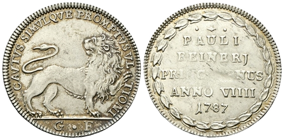Dr. CAVTVS SIMVLQVE PROMPTVS VL - TlONI (Cauto e insieme risoluto alla riscossa). Leone verso d., retrospiciente, con la zampa anteriore s. sollevata; in esergo, G• F (Girolamo Foscarini). Rv. PAULI / REINERJ / PRINC MUNUS / ANNO VIIII / 1787. Iscrizione disposta su cinque righe entro corona d'alloro.