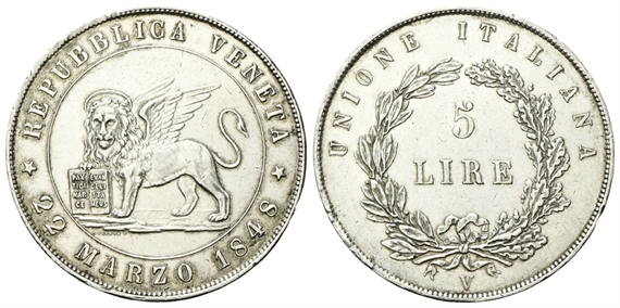 Governo Provvisorio di Venezia, 1848-1849. 5 Lire 1848, I Tipo 22 Marzo.