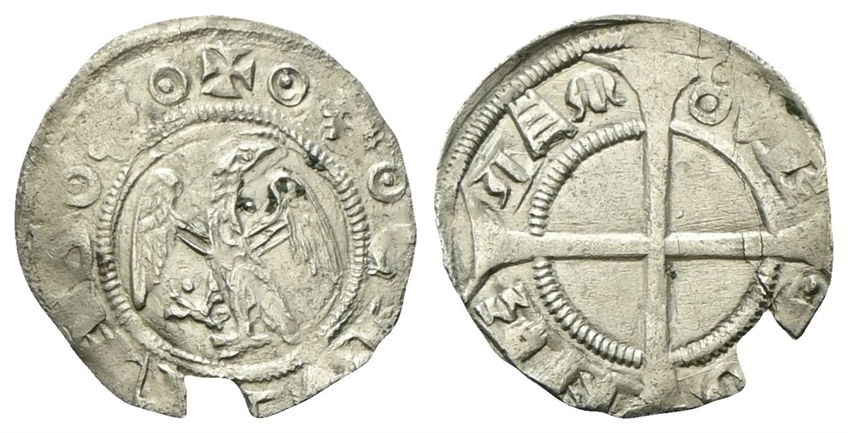 Dr. + °✿°CIVITAS°✿°. Aquila ad ali spiegate; sopra la zampa, globetto. Rv. °VE - RO - NE - A (scala) m. Croce patente entro contorno lineare che interseca la legenda.