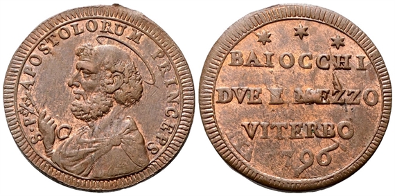 Dr. S• P - APOSTOLORUM PRINCEPS. Busto dell'Apostolo Pietro a s. con le chiavi in mano. Rv. BAIOCCHI / DVE E MEZZO / VITERBO / 1796. Iscrizione disposta su quattro righe.