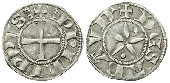 Dr. + (due fiori) PhILIPPVS (due fiori). Croce patente; nel 2° cantone, bisante. Rv. +DE SABAVD’. Fiore a 5 petali affusolati con due bisanti.