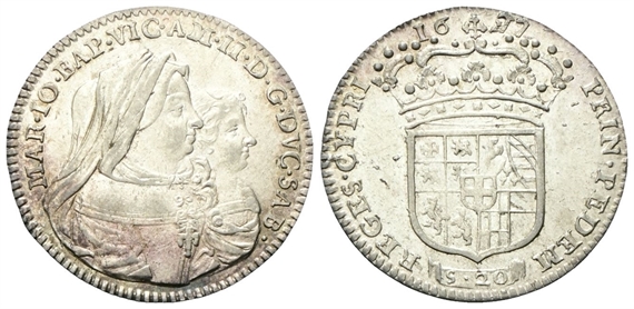 Dr. MAR • IO• BAP• VIC• AM• II• D• G • DVC• SAB•. Busti accollati a d. del Duca e della reggente velata. Rv. PRIN • PEDEM - REGES• CYPRI. Stemma coronato; sopra, 16 - 77 e, sotto, S 20 entro cartella.