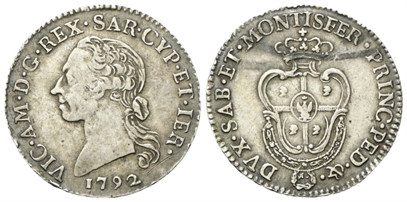 Dr. VIC• AM • D • G • REX • SAR• CYP • ET • IER• . Testa del re a s.; sotto, 1792. Rv. DVX • SAB• ET • MONTISFER • PRINC • PED • &• . Scudo sardo coronato.
