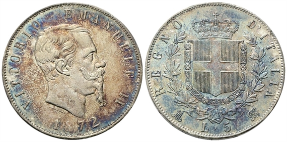 Vittorio Emanuele II, 1861-1878. 5 Lire 1872 Milano.