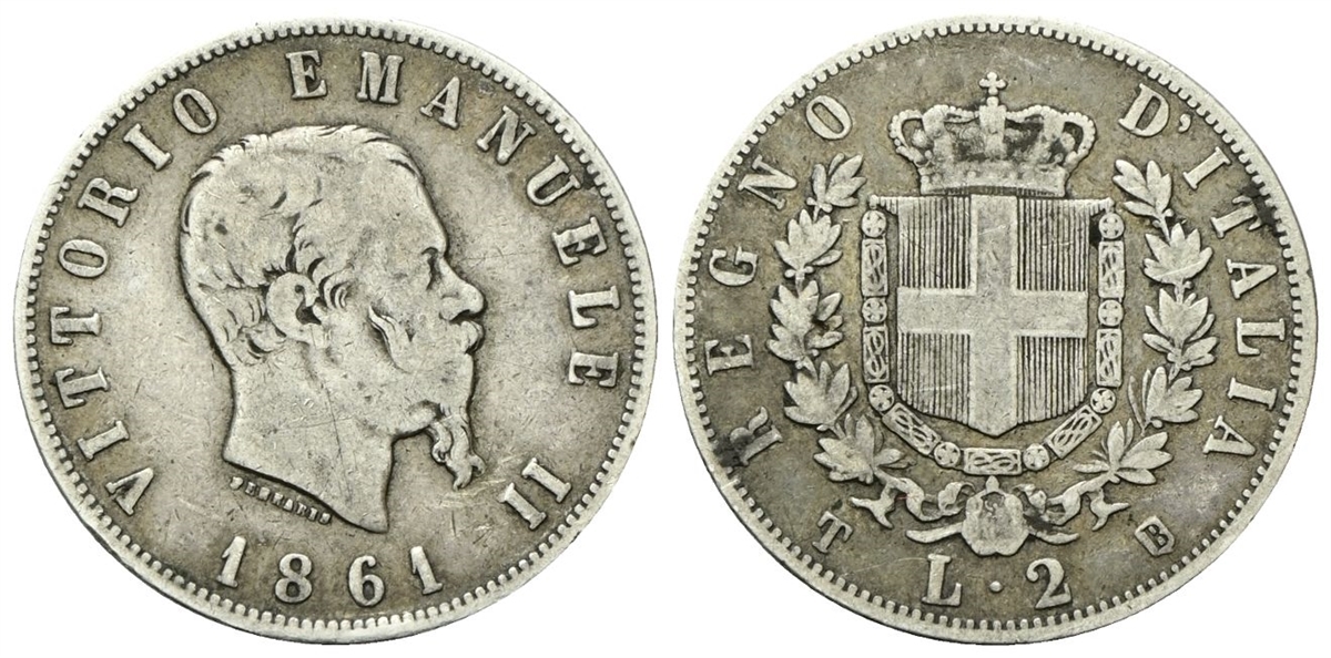 Vittorio Emanuele II, 1861-1878. 2 Lire 1861 Torino, I Tipo.