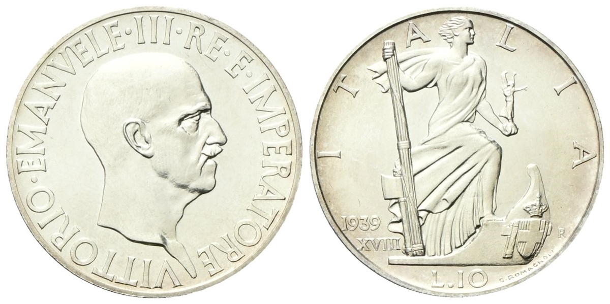 Vittorio Emanuele III, 1900-1943. 10 Lire 1939 a. XVIII Roma, Impero.