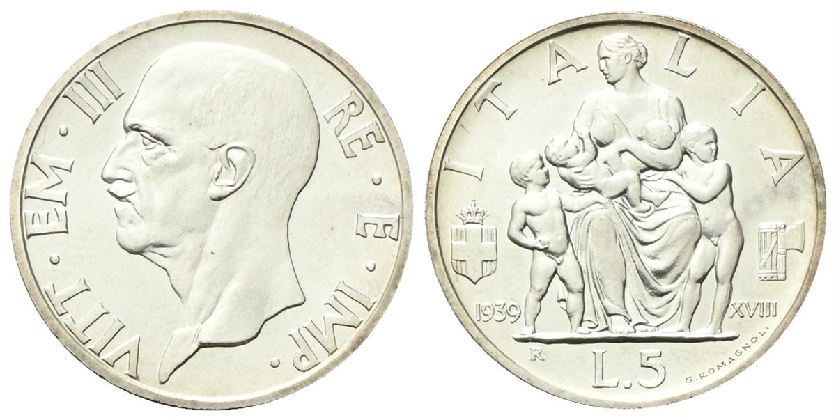 Vittorio Emanuele III, 1900-1943. 5 Lire 1939 a. XVIII Roma, Fecondità, coniato in 20 esemplari.