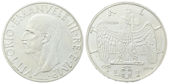 Dr. VITTORIO EMANUELE III RE E IMP. Testa scoperta del sovrano, rivolta a d.; sotto, G Romagnoli. Rv. ITALIA. Fascio littorio sormontato da aquila rivolta a s. ad ali spiegate in posizione frontale; nell’esergo, stemma sabaudo tra valore e data; in alto, a s., PROVA.