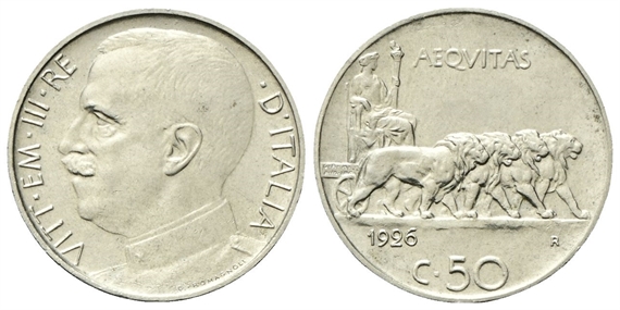 Vittorio Emanuele III, 1900-1943. 50 Centesimi 1926 Roma, Leoni, bordo liscio.