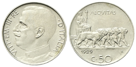 Vittorio Emanuele III, 1900-1943. 50 Centesimi 1929 Roma, Leoni, bordo Rigato.