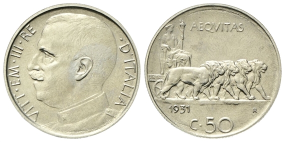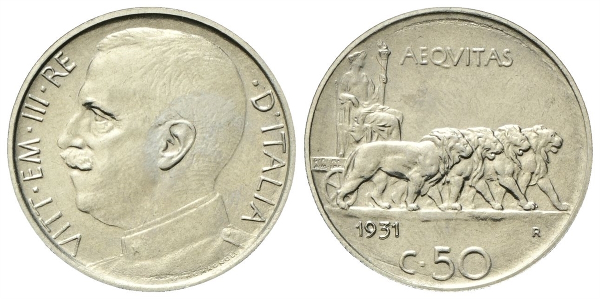 Vittorio Emanuele III, 1900-1943. 50 Centesimi 1931 Roma, Leoni, bordo Rigato.